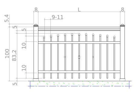 Ograda se sastoji od vertikalnih palica s promjerom od 20 mm, koje su gore zatvorene poklopcima palica: šiljak, kuglica ili čep. Ograda je gore završena sa rukohvatom.