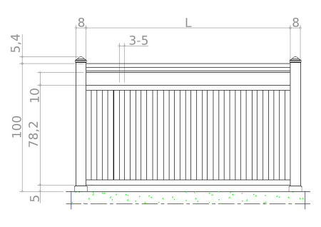Ograda se sastoji od vertikalnih aluminijskih letvica širine 90 mm, debljine 18 mm, koje nemaju poklopce. Ograda je gore završena sa rukohvatom.